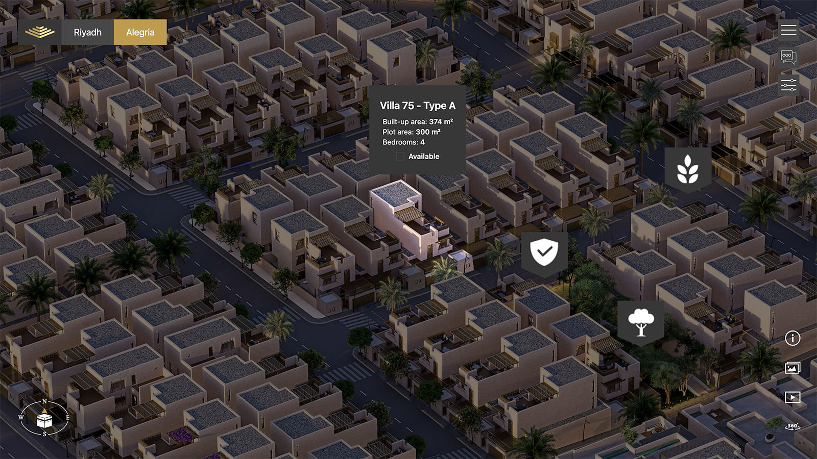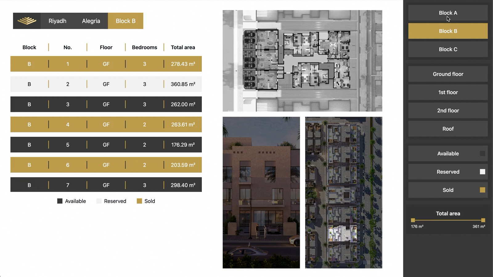 Visitors explore the masterplan to inspect specific blocks or villas. Selecting a building reveals an inventory list, enabling customers to filter units by availability, floor, and surface area.