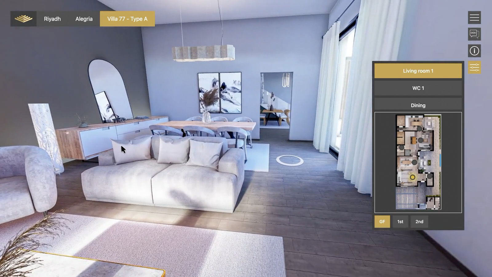 Selecting a unit opens a high-fidelity 360° virtual tour, offering an immersive exploration of the interior layout and finishes.